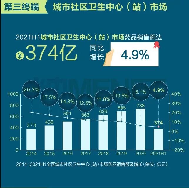 2021年上半年我國(guó)三大終端六大市場(chǎng)(定義范圍詳見文末“數(shù)據(jù)說明”)藥品銷售額達(dá)8393億元,同比增長(zhǎng)8.8%。從實(shí)現(xiàn)藥品銷售的三大終端的銷售額分布來看,公立醫(yī)院終端市場(chǎng)份額最大,2021上半年占比為63.8%;零售藥店終端市場(chǎng)份額2021上半年占比為26.4%;公立基層醫(yī)療終端市場(chǎng)份額2021上半年占比為9.8%。以上統(tǒng)計(jì)數(shù)據(jù)未包含“民營(yíng)醫(yī)院、私人診所、村衛(wèi)生室”。